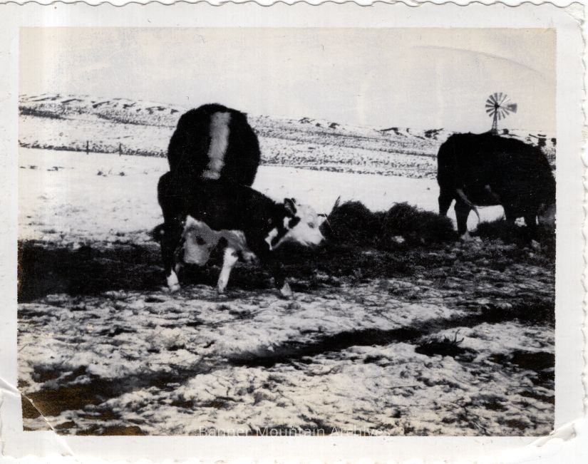 Hereford calf with cows on the feedline, windmill in background, circa 1950s.Photograph Details