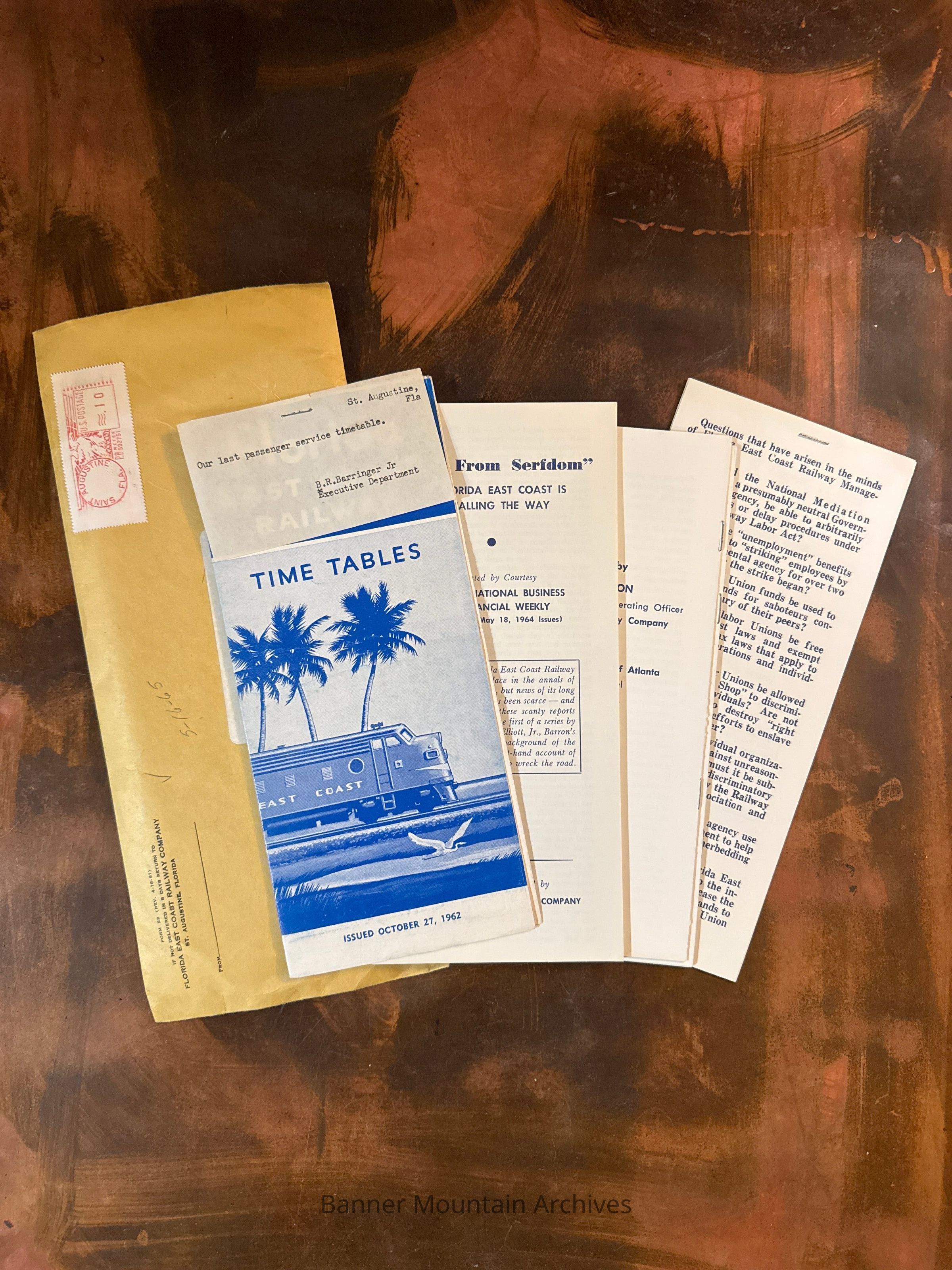 Florida East Coast timetable, note attached “Our last passenger service timetable, B.R Barringer, Jr., Executive Department,” October 27, 1962.Creator