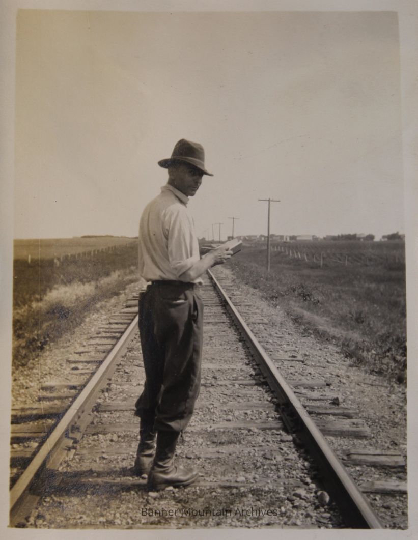 Chicago and North Western railroad surveyor with book, possibly in Iowa, circa 1907.Photograph Details