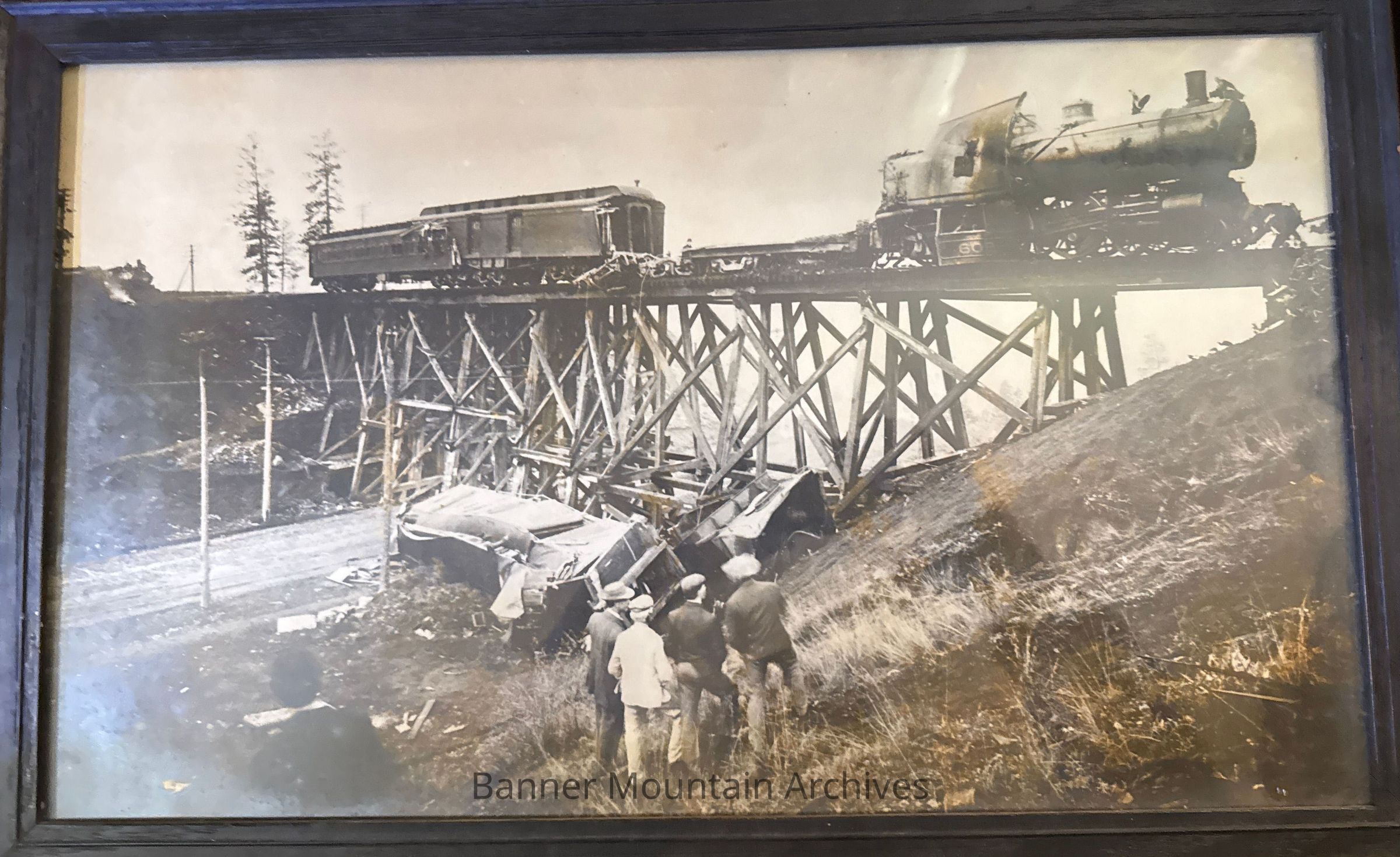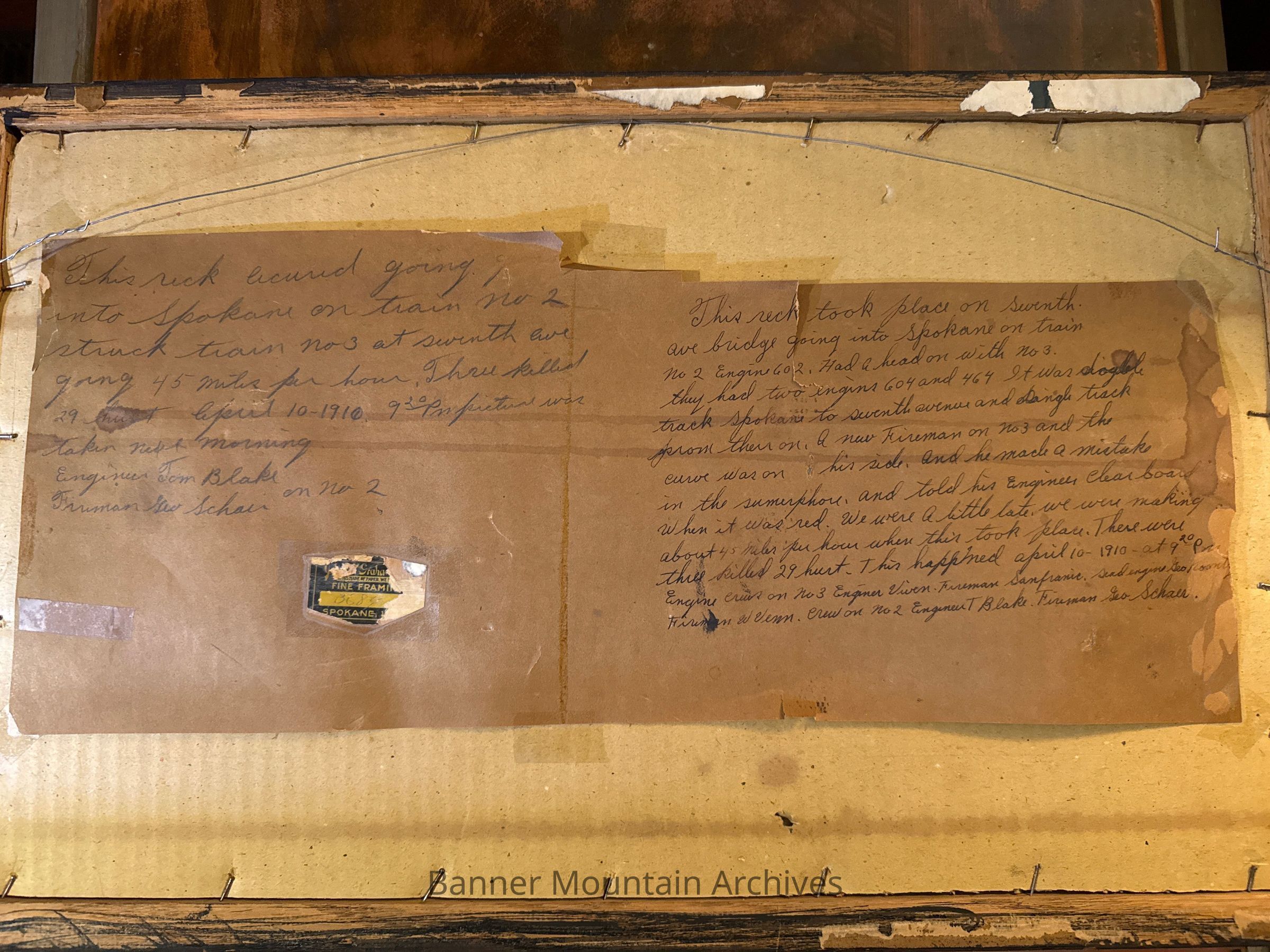 Aftermath of a head-on collision between two. Spokane, Portland and Seattle trains on a bridge on April 10, 1910, fireman’s account handwritten on back, photo taken the next day, April 11, 1910.