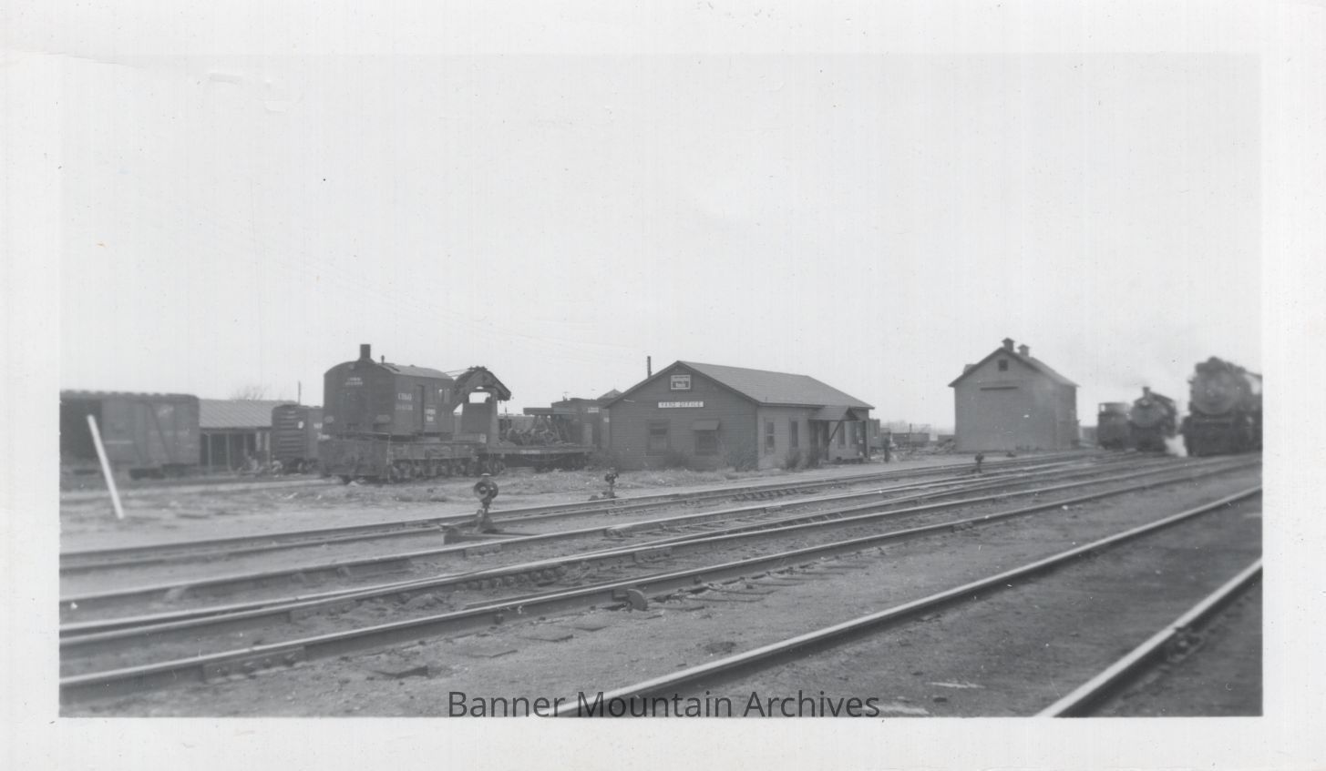 Chicago, Burlington and Quincy Casper yard showing the yard office and wrecking crane, approaching freight train to right, circa 1940.