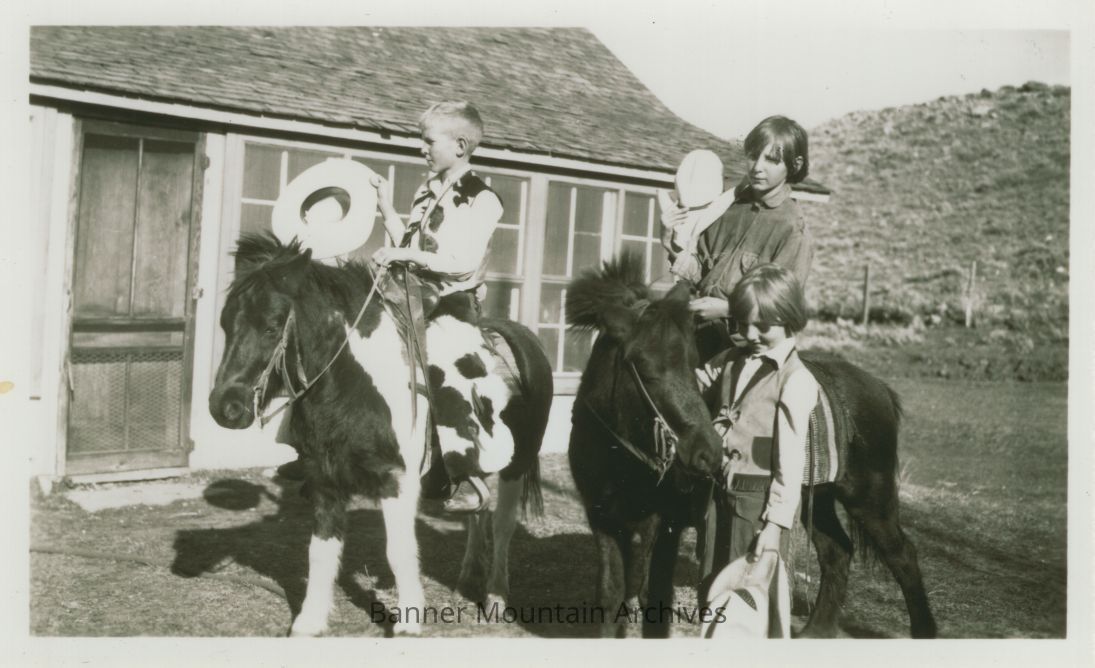 McCleary children with their ponies at the Banner Ranch, Bryant "Cactus," Lenora "Babe," and Marion "Mickey" McCleary, circa 1930s.Photograph Details