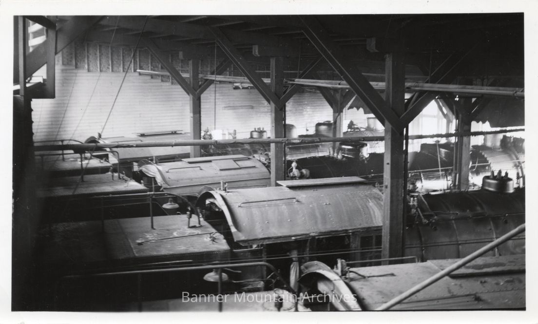 Steam locomotives in the Chicago, Burlington & Quincy roundhouse in Casper, circa 1940s.