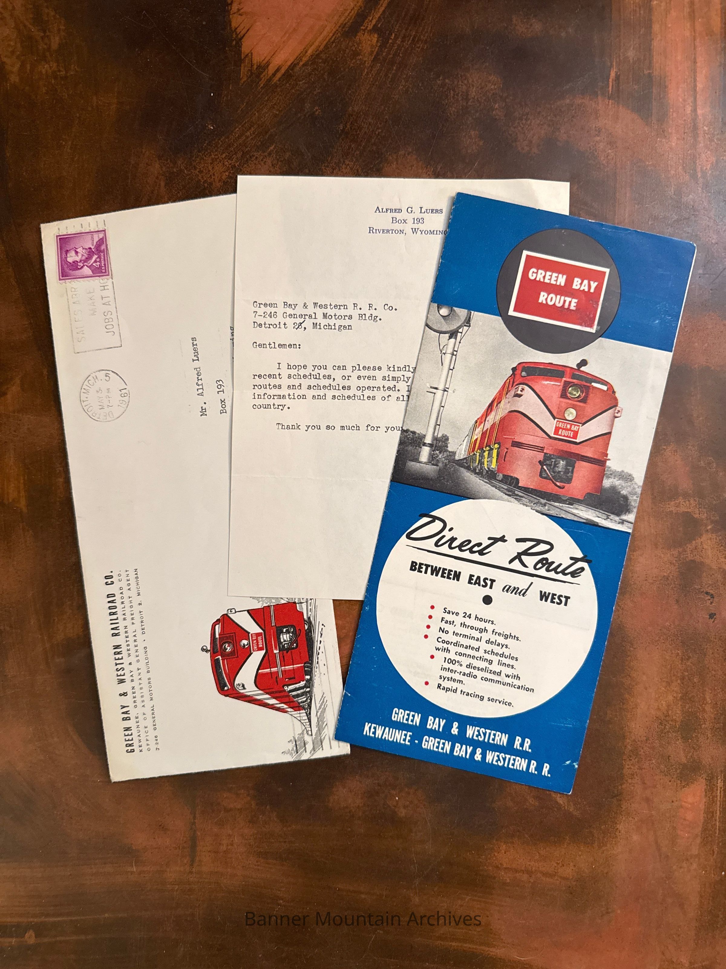 Green Bay & Western Railroad Co. envelope sent to Alfred Luers of Riverton, WY, 1961.Creator