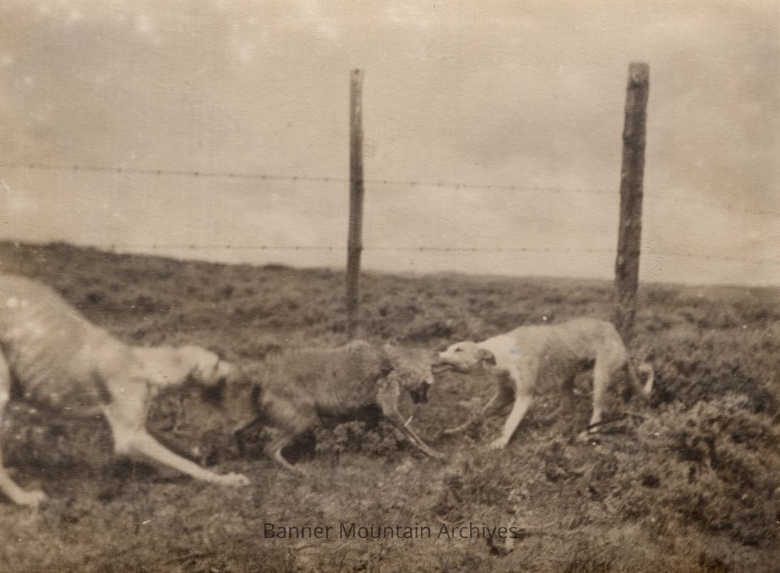 Lena McCleary's hunting dogs with a coyote, circa 1930s.