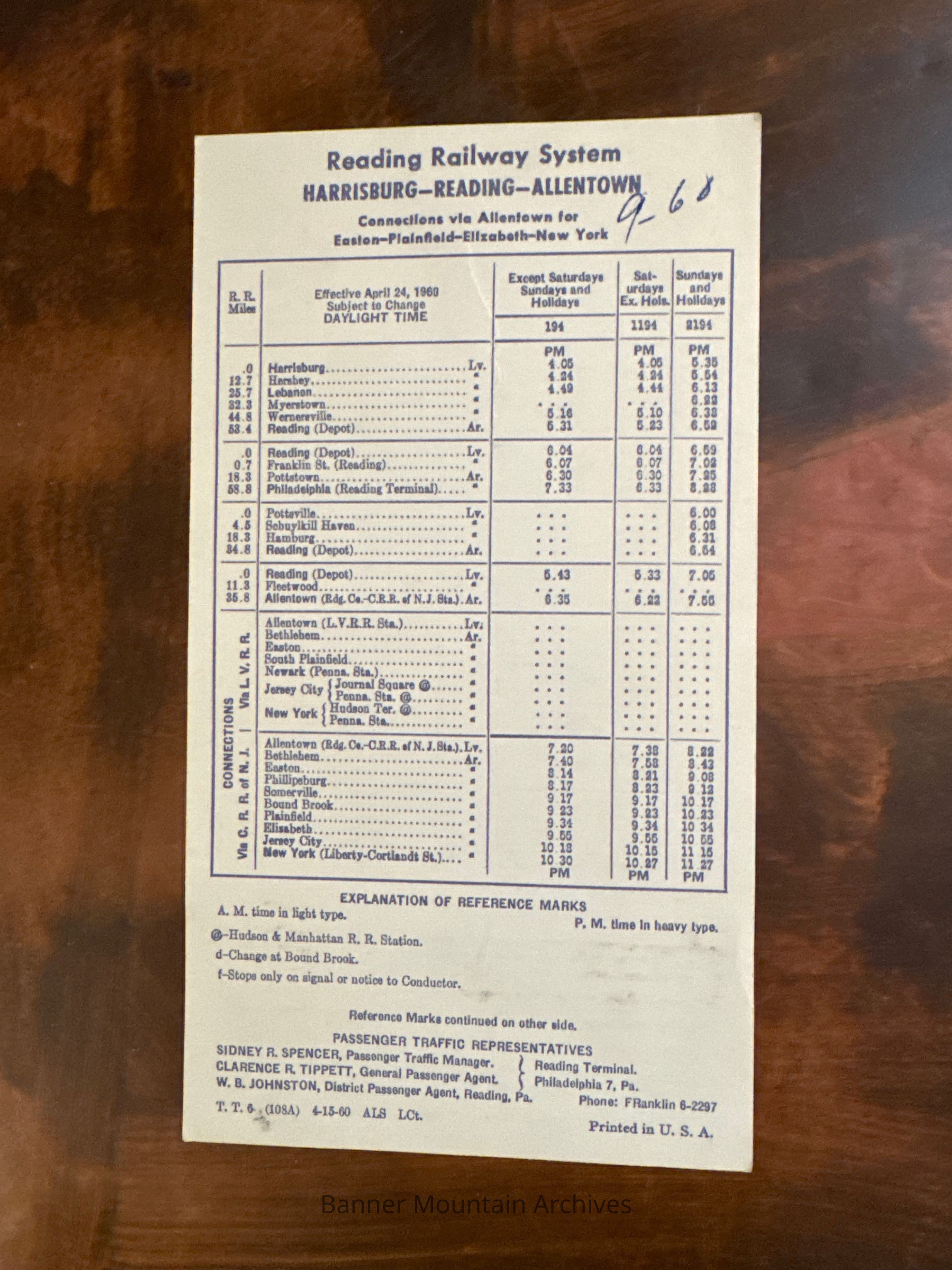 Timetable sheet for the Reading Railway, April 24, 1960, received by Alfred Luers September 1960.