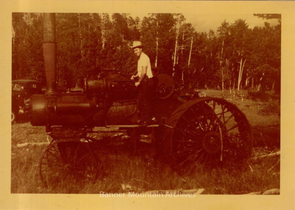 Man on a steam tractor, Banner Ranch truck in the background, circa 1951.Photograph Details