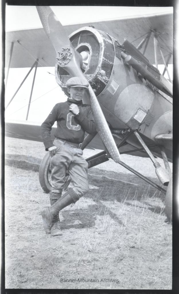 Unknown boy with a biplane at the Wardwell airfield, circa 1926. Negative.Photograph Details