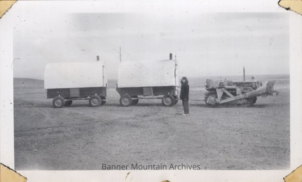 D4 Caterpillar with sheepwagons, unknown woman, Banner Ranch, circa 1940s.Photograph Details