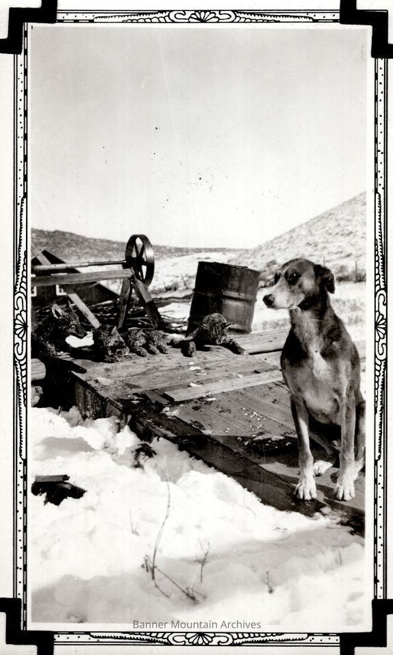 Hunting dog "Splash" after a bobcat hunt, circa 1930s.