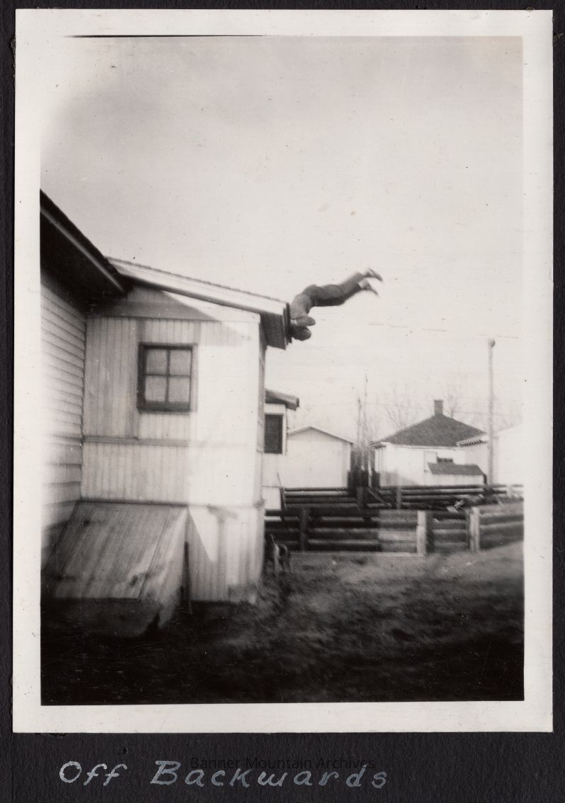 Tom Cole rolling off a roof backwards, circa 1920s.