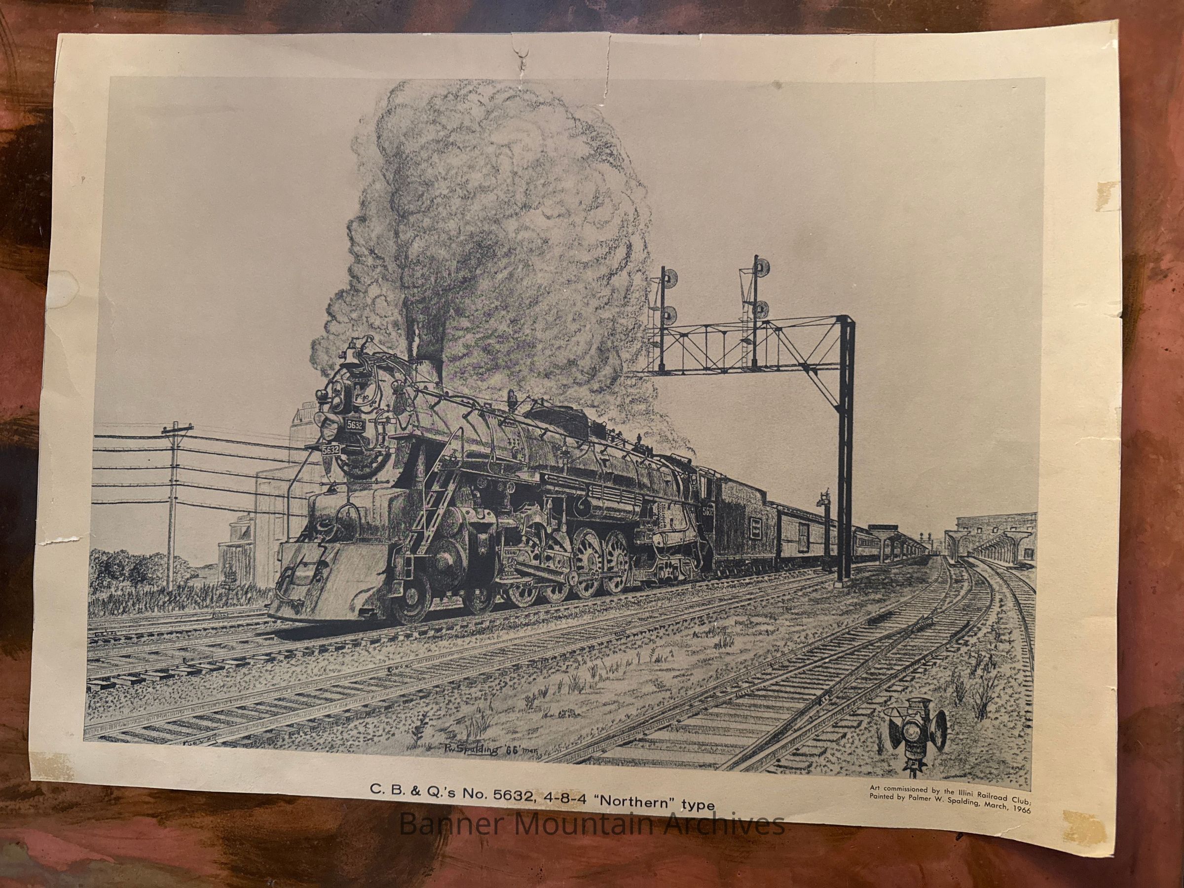 Print of a painting of CB&Q 4-8-4 “Northern” type steam locomotive #5632 commissioned by the Illini Railroad Club, March 1966.