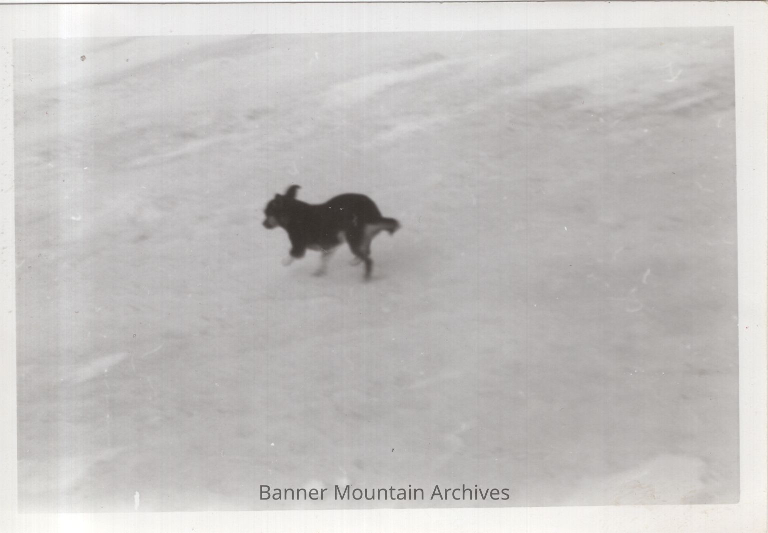 Dog in the snow at the Banner Ranch, circa 1930s.