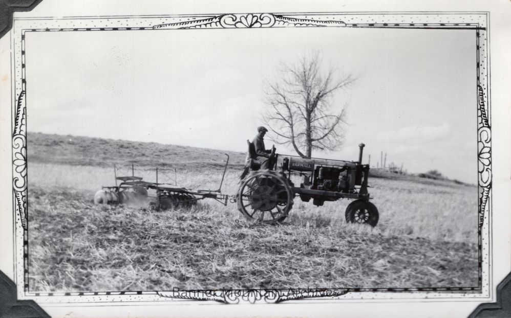 Mike McCleary disking a hayfield with the Banner Ranch's first tractor, circa 1930s.Photograph Details