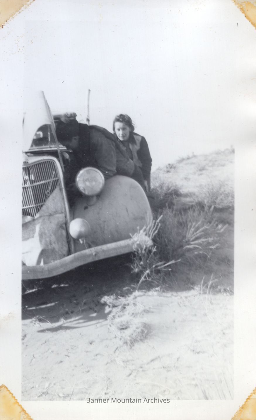 Lois May Thornton and another woman working on the engine of a car, circa 1939.Photograph Details