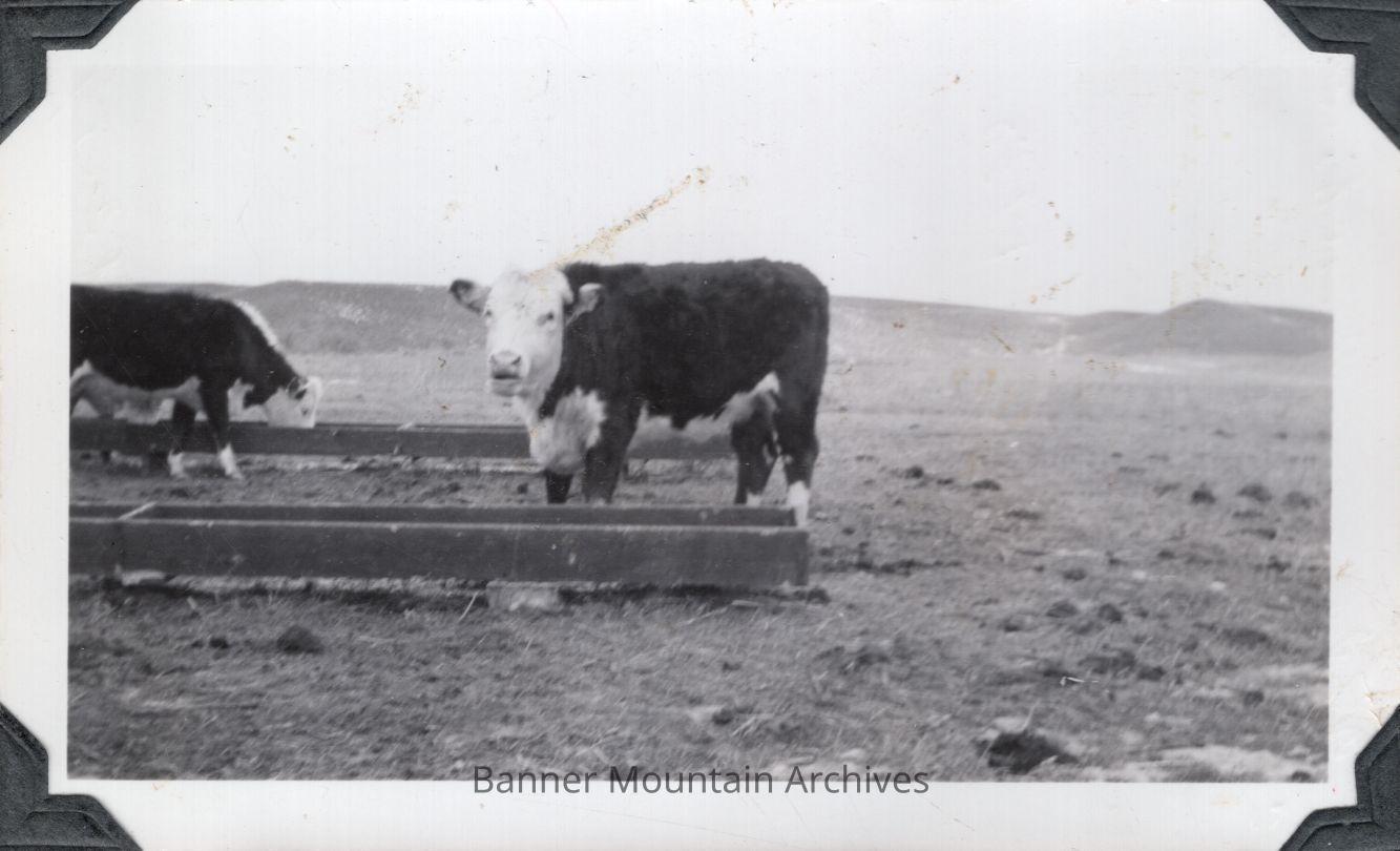 Banner Ranch Hereford cows at feed troughs, circa 1930s.