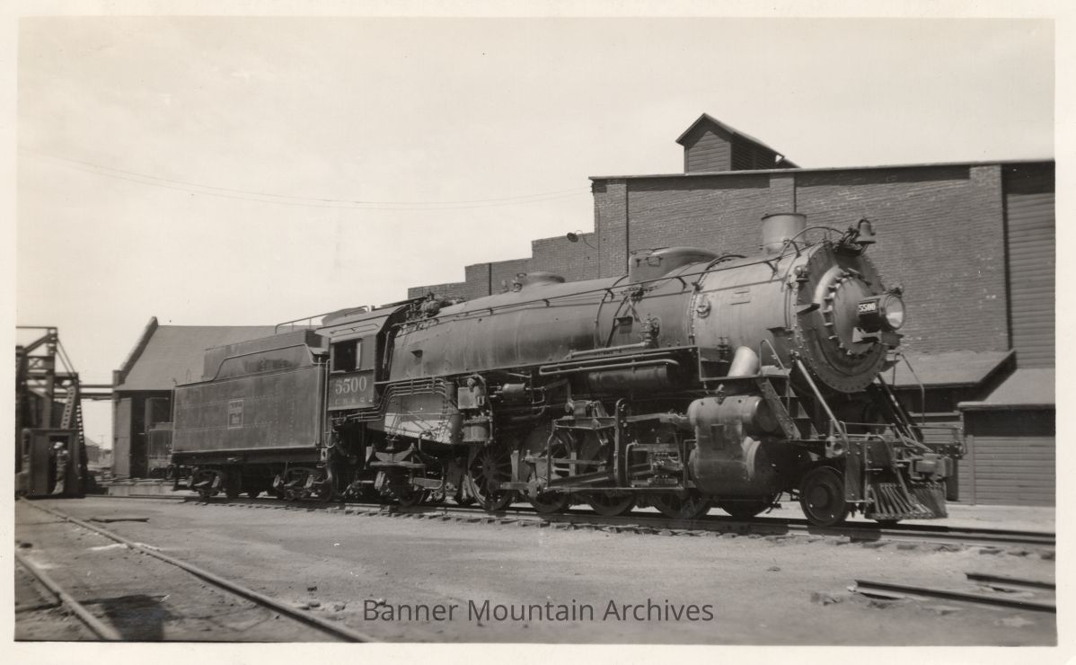Chicago, Burlington and Qunicy 2-8-2 O-4 steam locomotive #5500 built by Baldwin in 1919 outside of the Casper, WY roundhouse, August 1938.