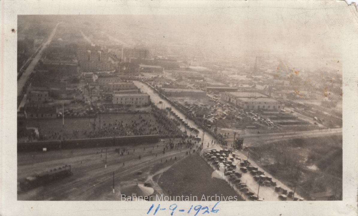 Crowd at Center Street Crossing of the Chicago, Burlington and Quincy Railroad on the arrival of Queen Marie of Romania's special train at the Casper Depot. Photo taken by Tom Cole from the top of the 200-foot tall powerplant smokestack. Cole was taken out of service for two weeks for the climb. November 9, 1926.