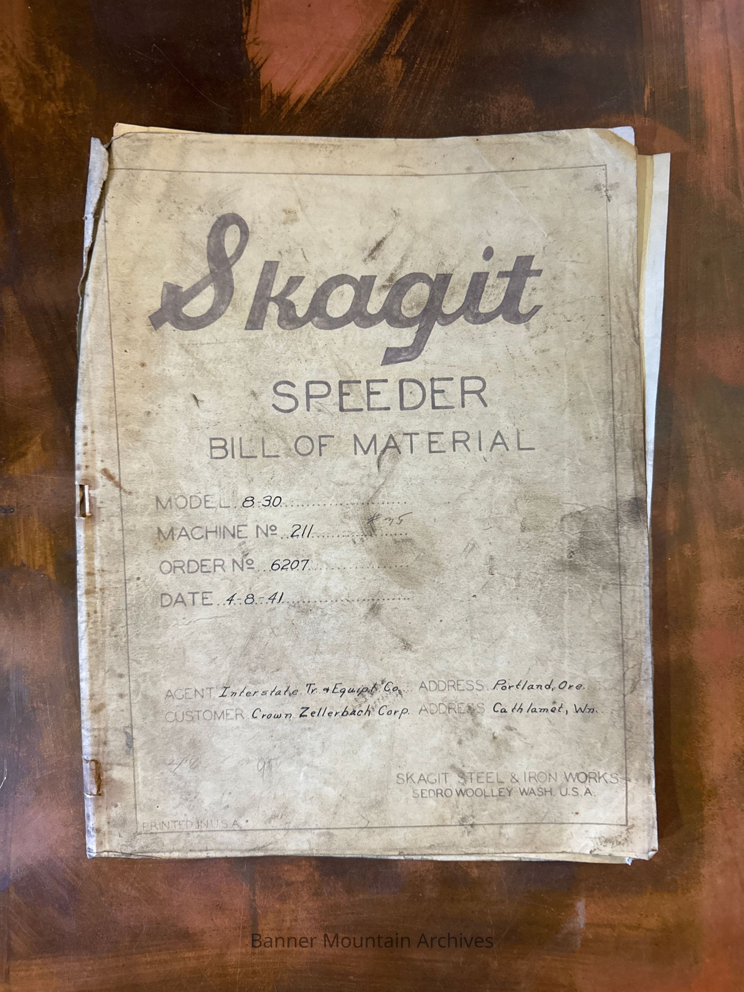Bill of material for a Skagit speeder, model 8-30, machine no. 211, for the Crown Zellerbach Corp., April 8, 1941.