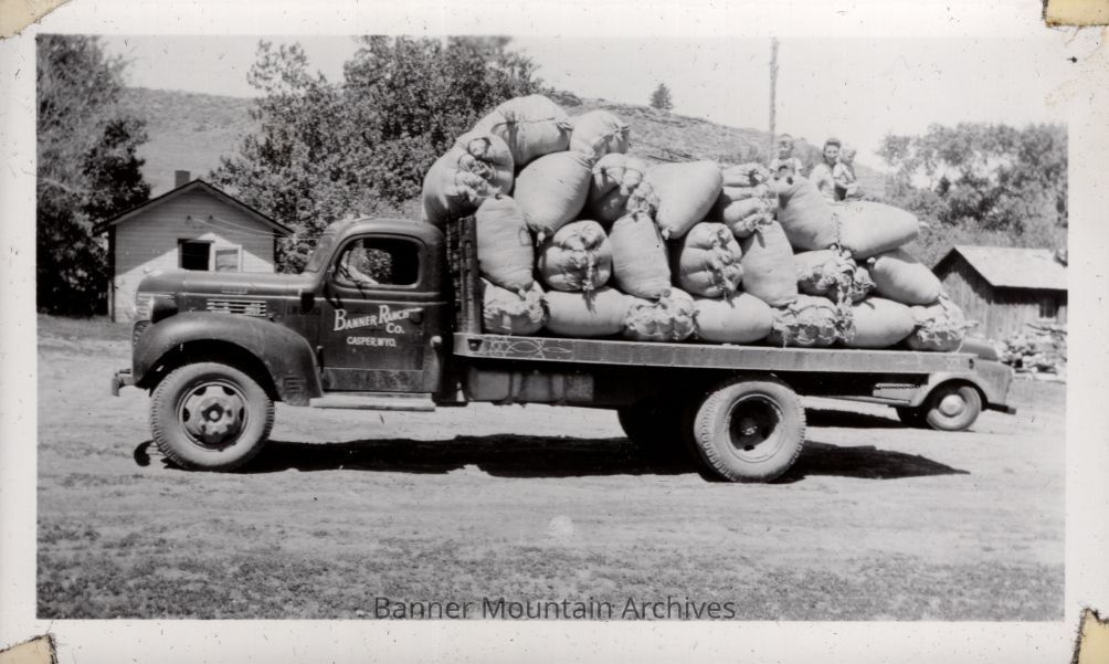 Ranch truck loaded with wool sacks.
