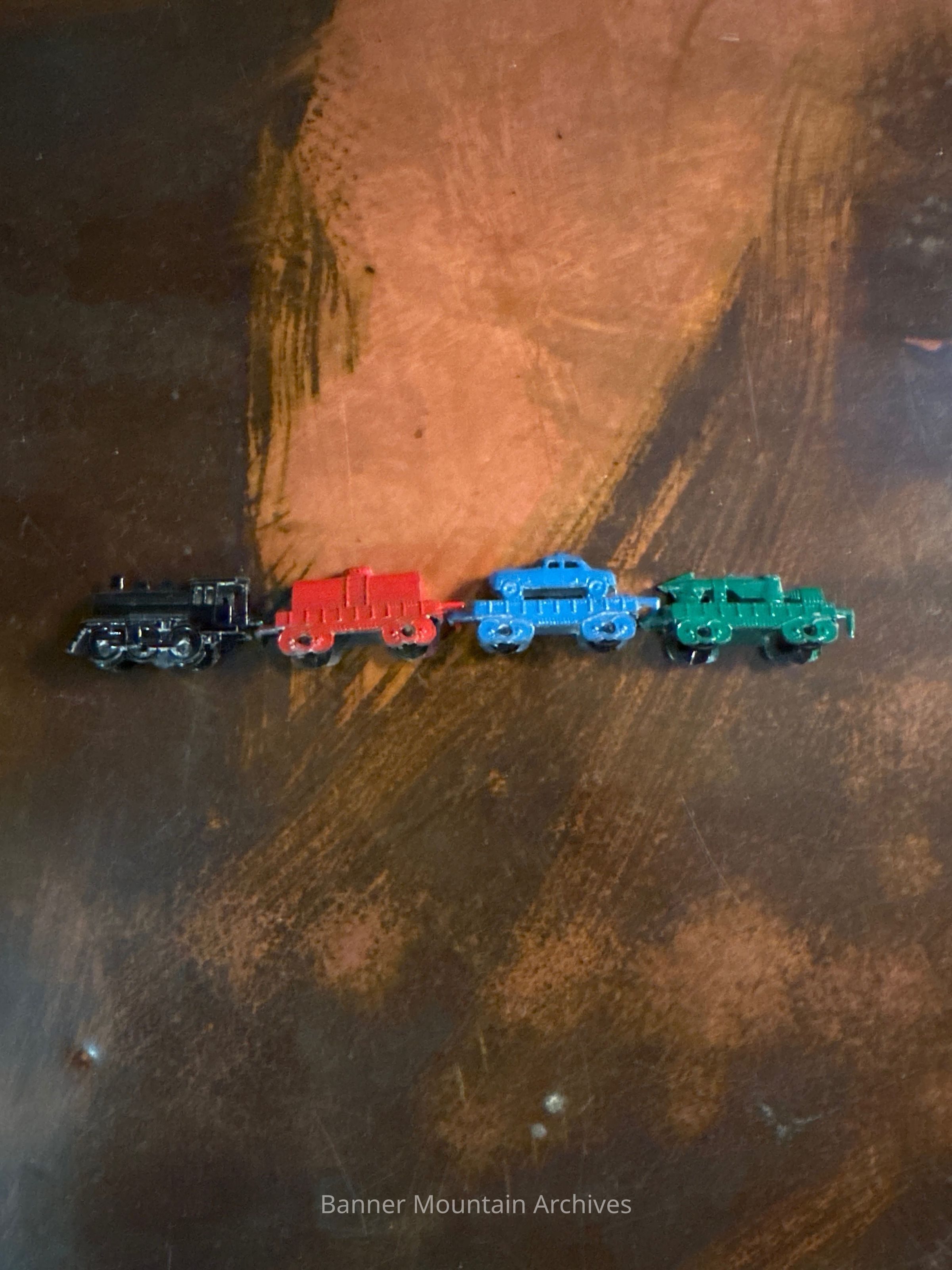 Small metal toy train, one engine, three cars including a tank car, an auto car and a missile car.