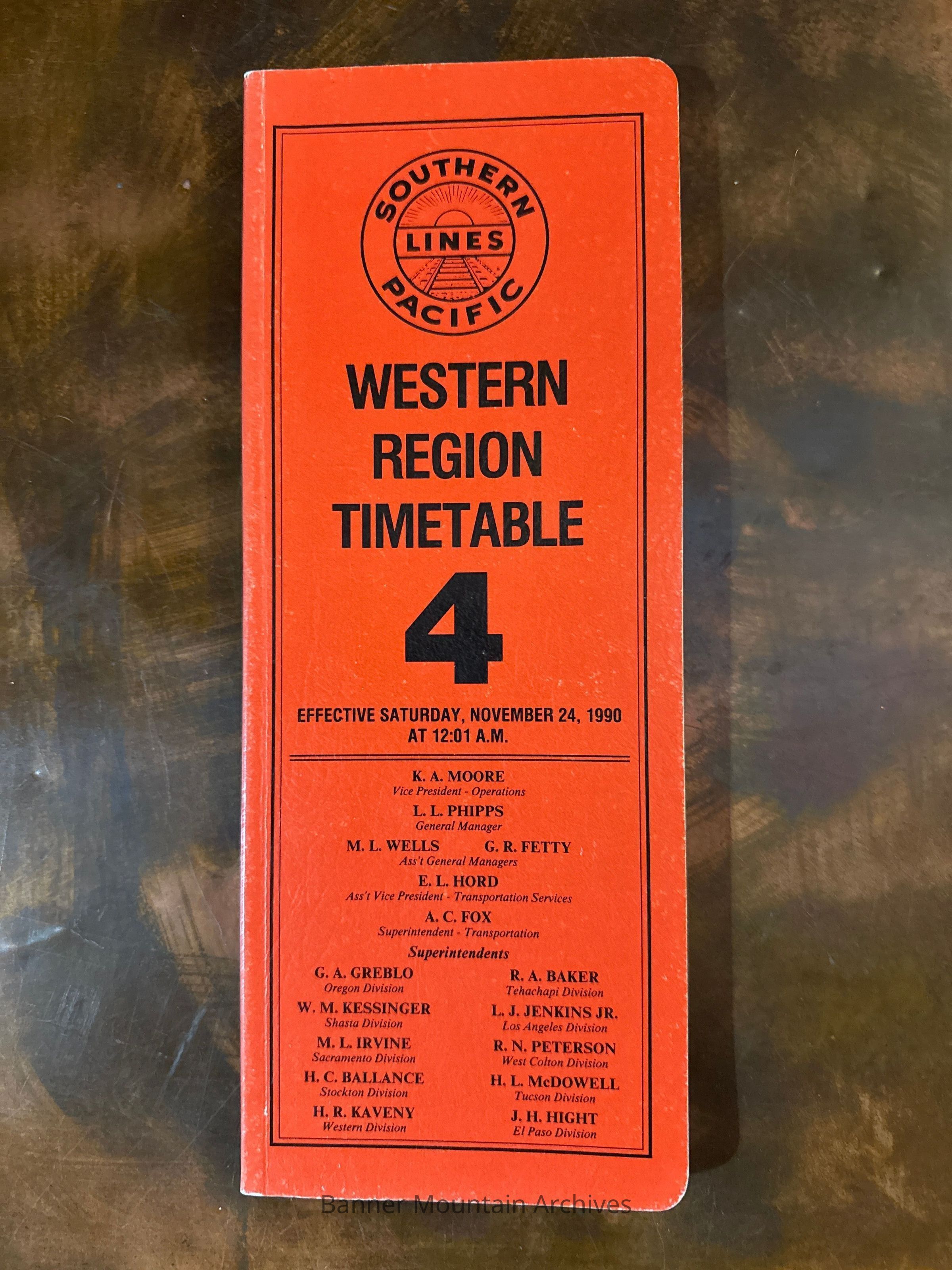 Timetable for the Western Region of the Southern Pacific, no. 4, November 24, 1990.