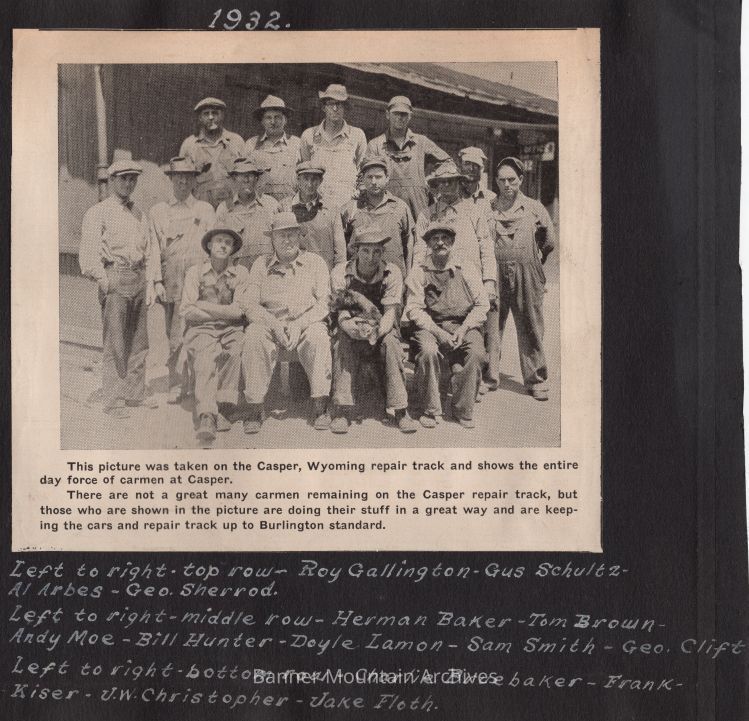 Chicago, Burlington and Quincy Railroad, Roy Gallington, Gus Schultz, Al Arbes, George Sherrod, Herman Baker, Tom Brown, Andy Moe, Bill Hunter, Doyle Lamon, Sam Smith, George Clift, Charlie Bruebaker, Frank Kiser, J.W. Christopher, Jake FlothSubject Place