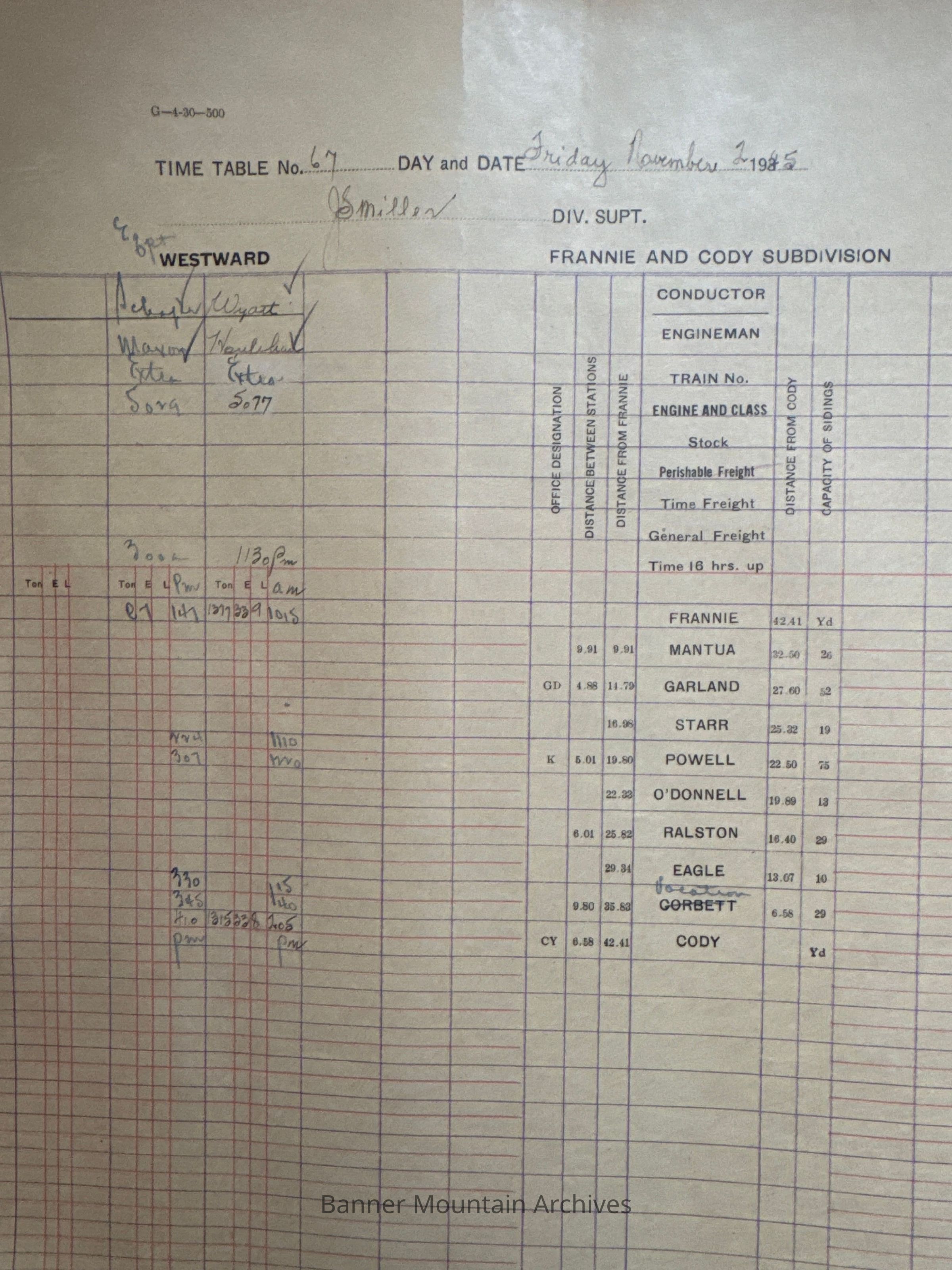 CB&Q Dispatcher’s Record of Train Movements-Cody SubDescription