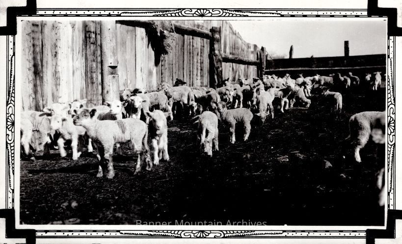 Banner Ranch lambs in a pen, circa 1930s.