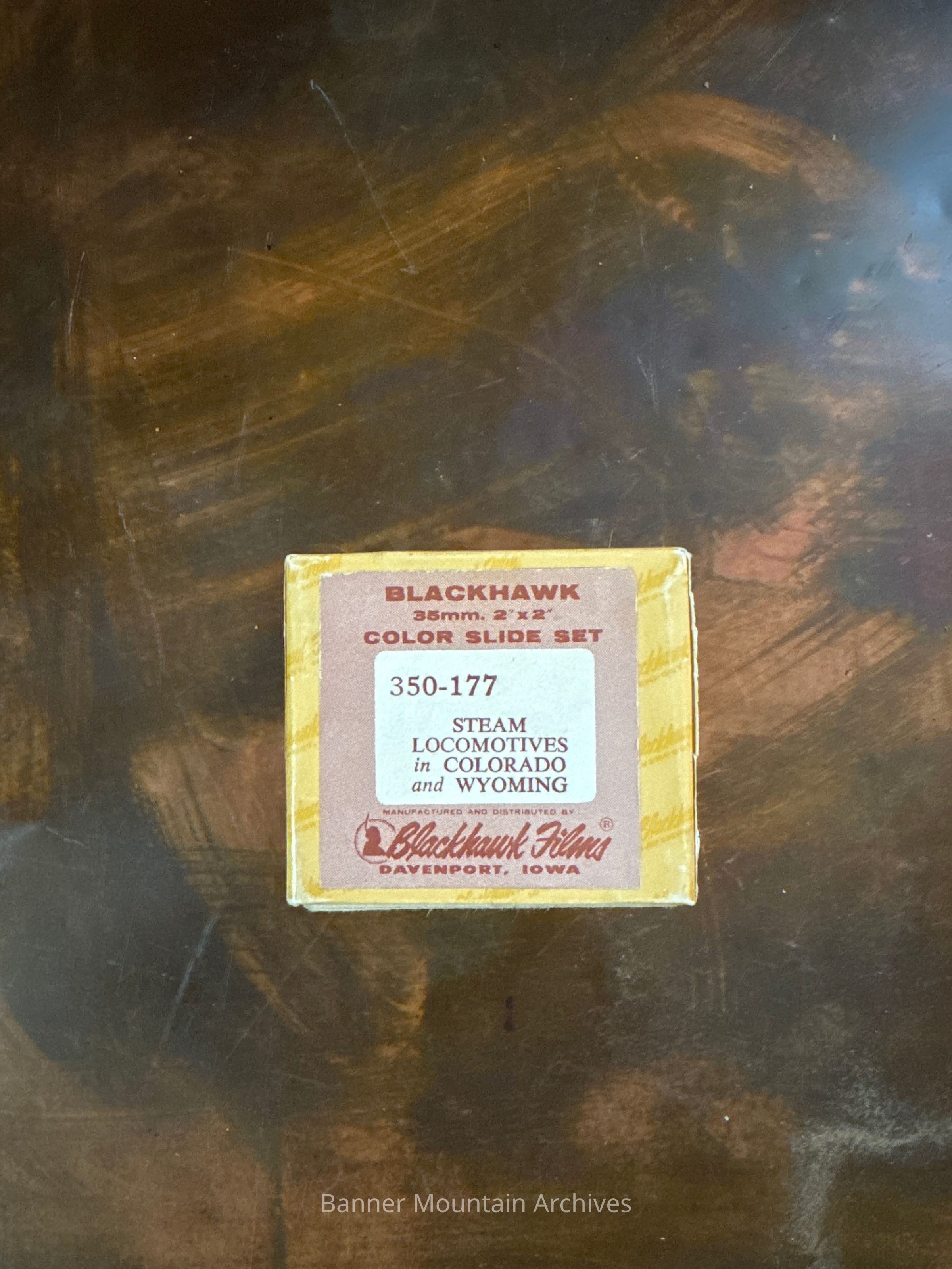 35mm 2" x 2" color slide set from Blackhawk Films, no. 350-177, "Steam Locomotives in Colorado and Wyoming." Set of 19 slides in original box.Category