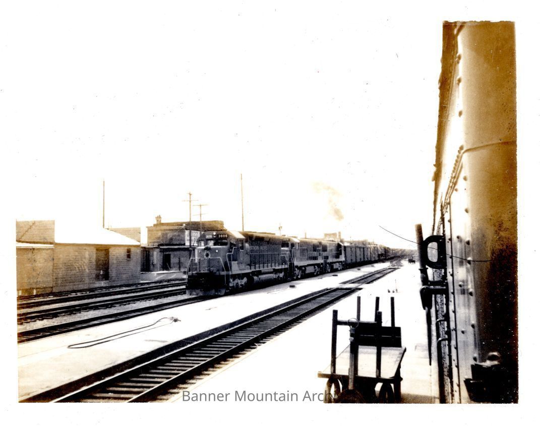 Northern Pacific freight train viewed from a Chicago, Burlington and Quincy Railroad passenger train, Billings, Montana, August 11, 1967.