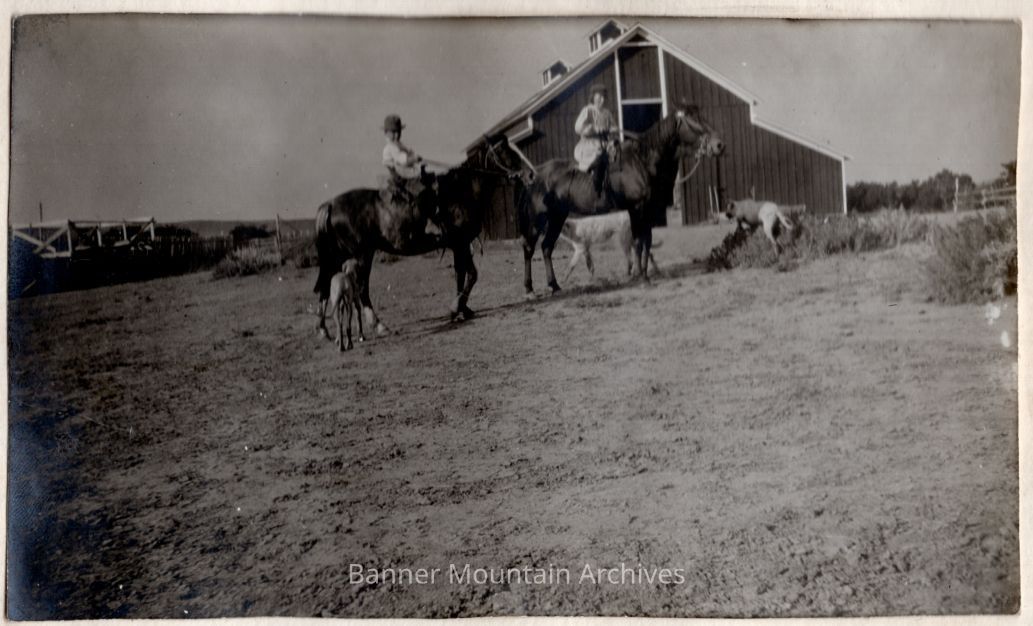 Silas and Melissa Brooks on horses with the hunting dogs, one of the horses named "Old Injun," circa 1900s.