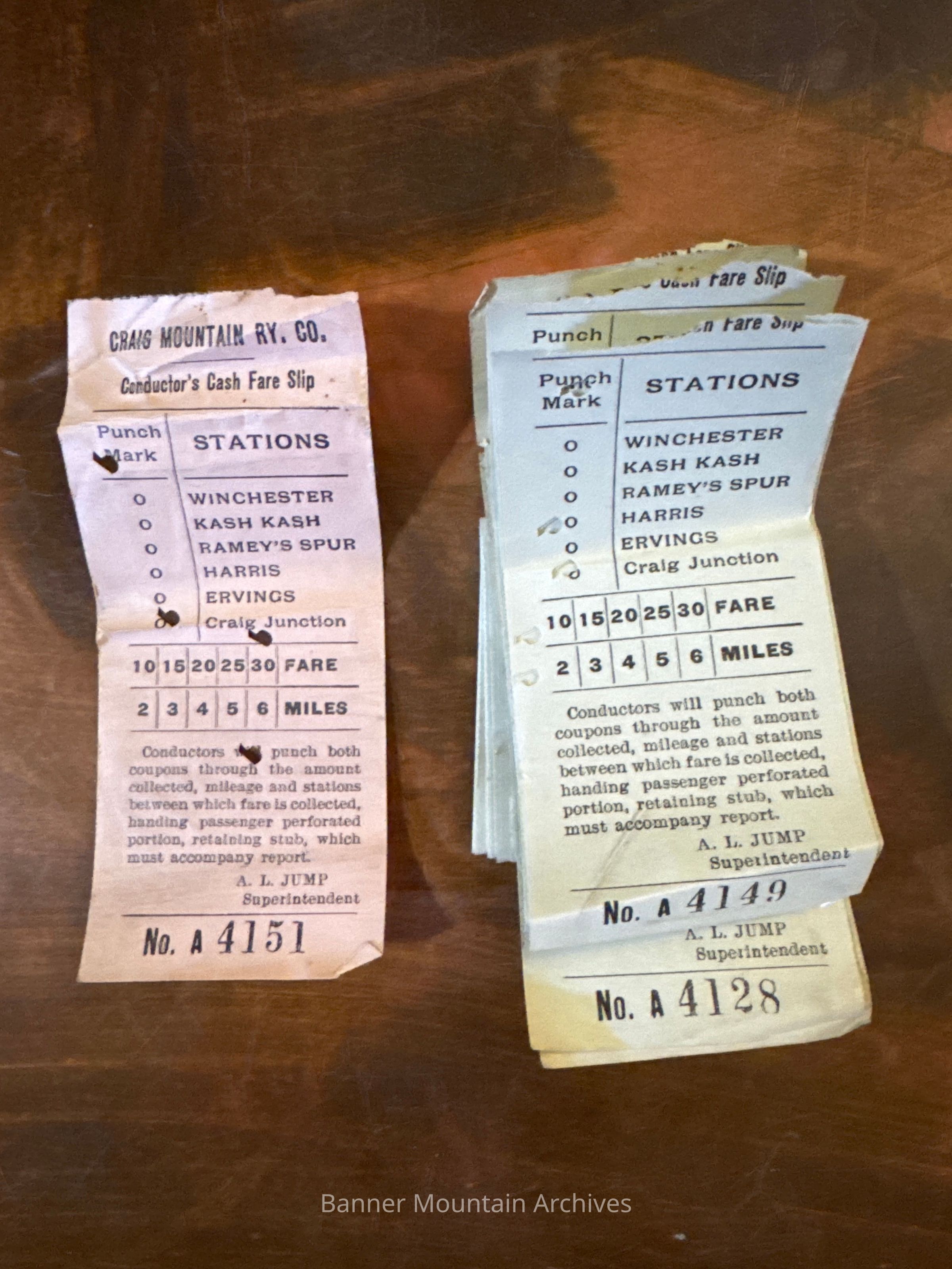 Craig Mountain Railway Co. conductor’s cash fare slips showing stations between Winchester and Craig Junction, Idaho.