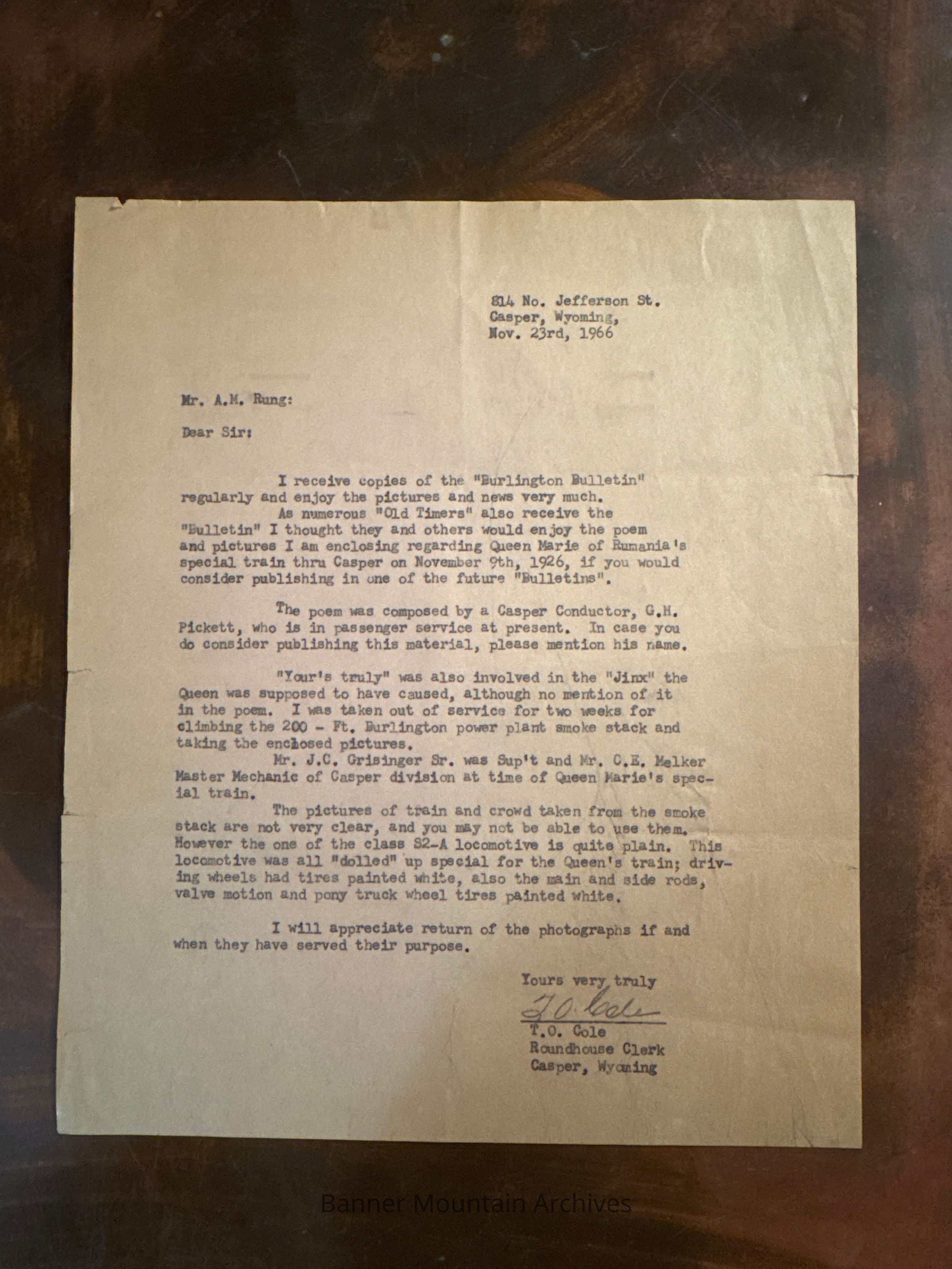 Letter from Tom Cole to A.M. Rung of the Burlington Bulletin regarding the Queen Marie Special, November 23, 1966.Subject Person/Organization