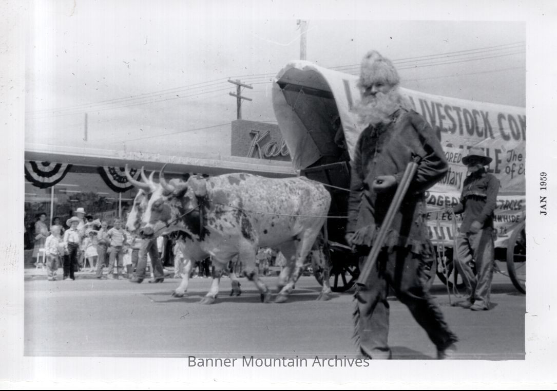 Ox-drawn wagon and "pioneers" in a Casper parade, 1959.