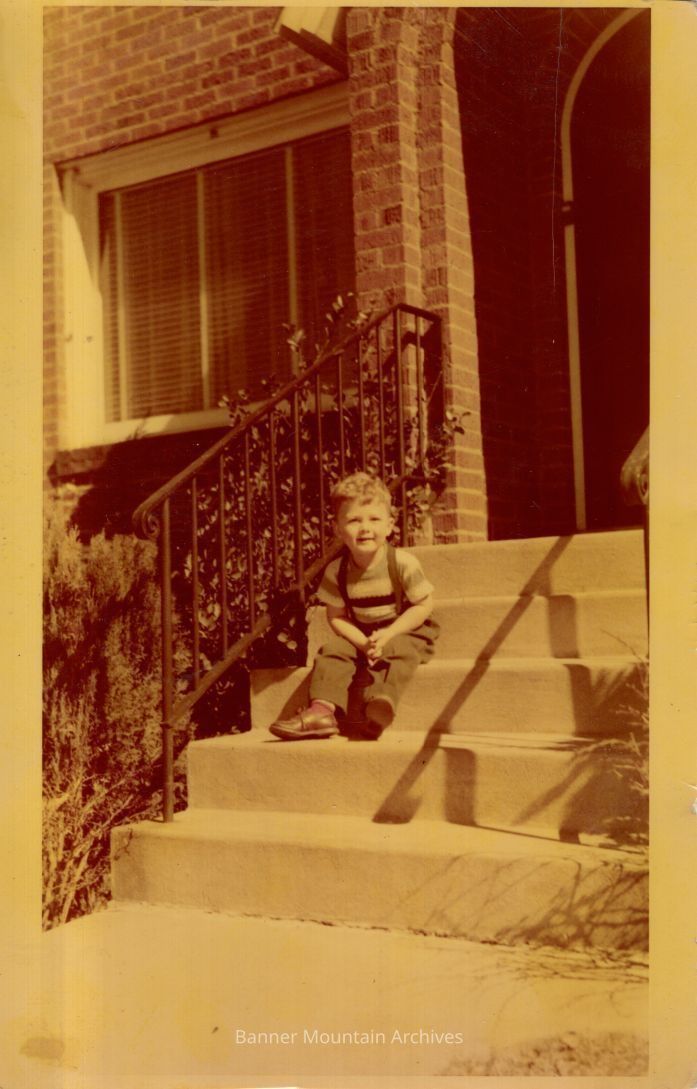 Unknown child on steps in front of a building, unknown location, circa 1951.Photograph Details