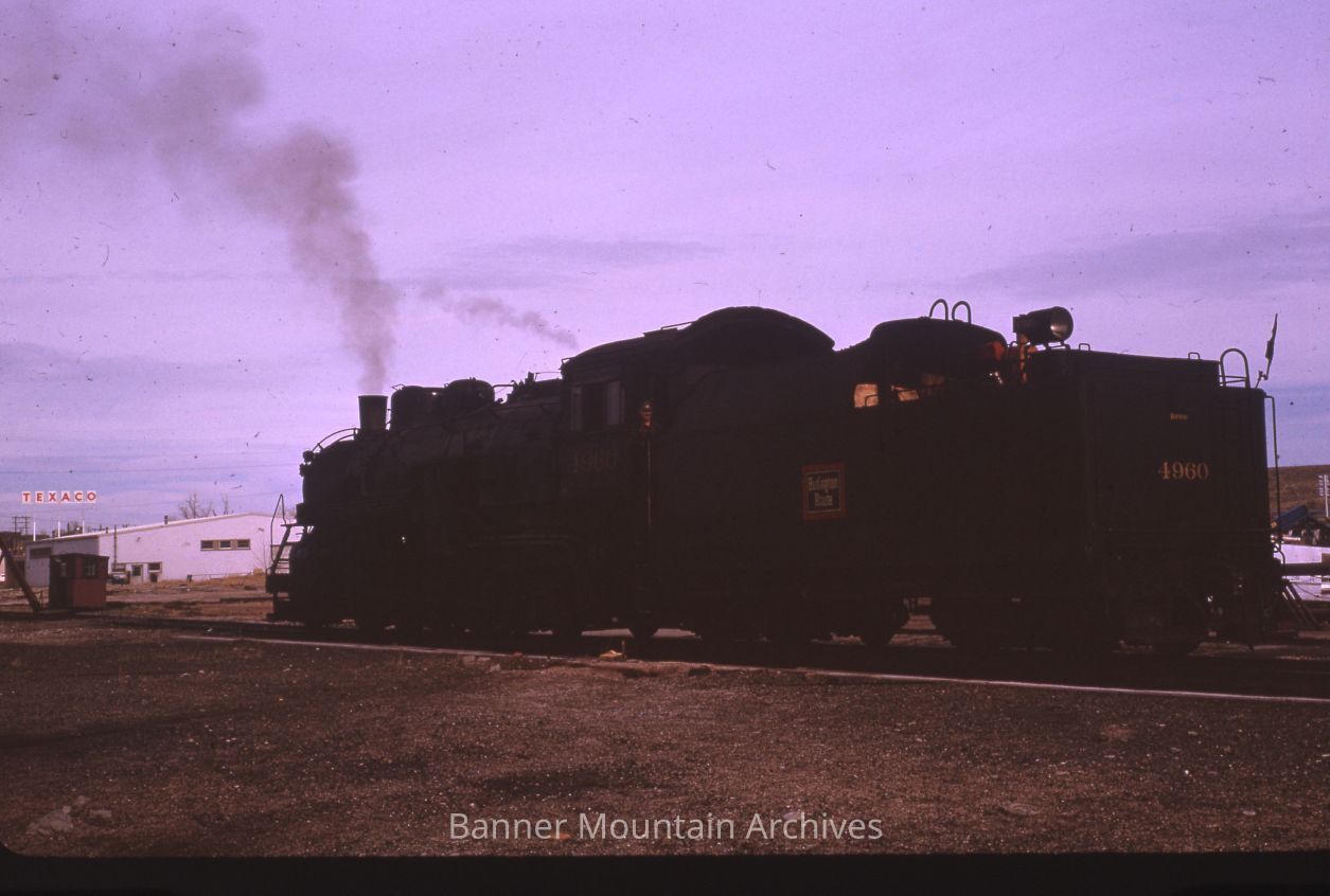 Chicago, Burlington and Quincy Railroad steam locomotive #4960 near the Casper roundhouse, May 7, 1963.