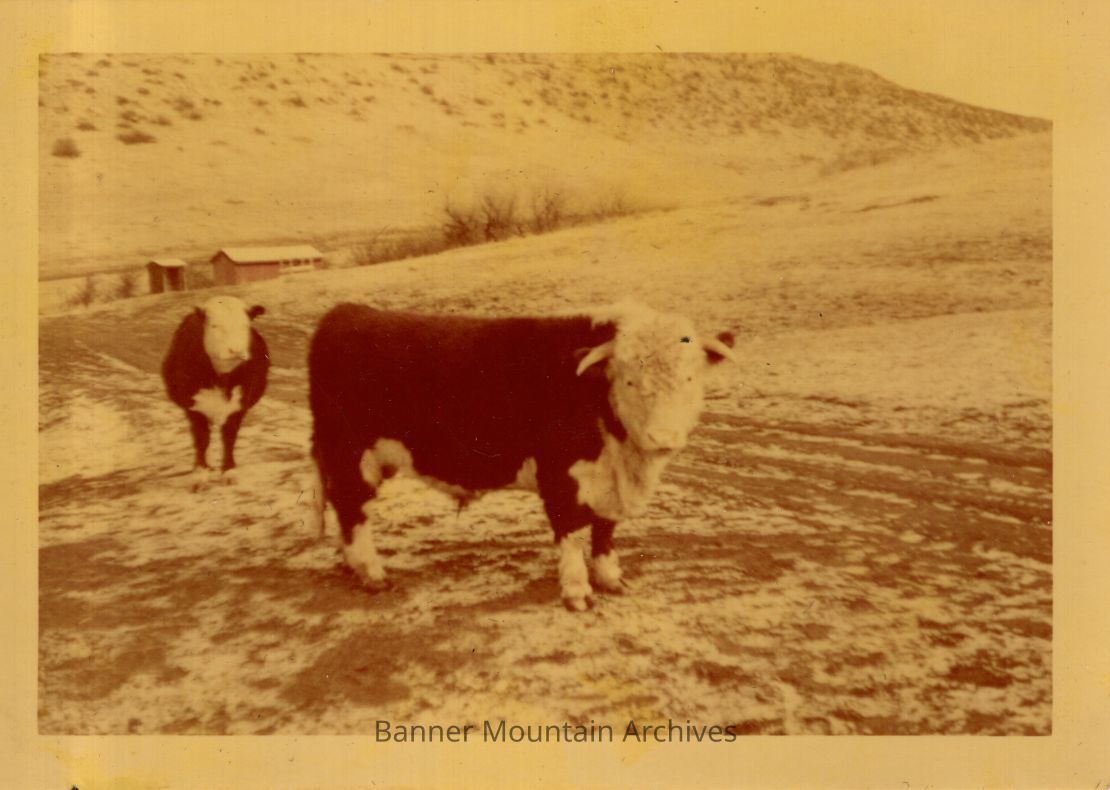 Hereford bulls, oil shed and gas pump house in the background, circa 1950s.