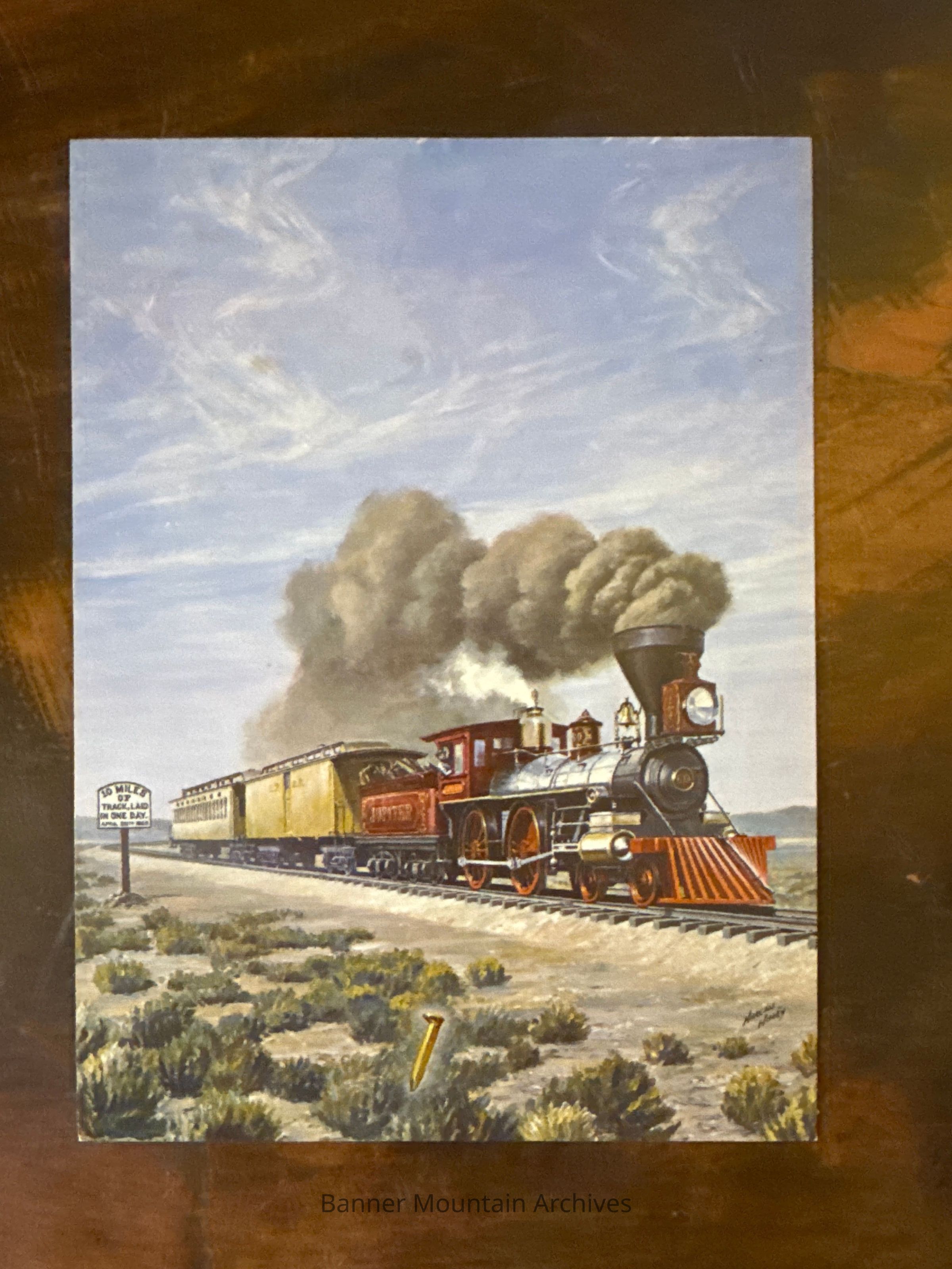 Postcard of a painting of Central Pacific “Jupiter” pulling the special train to Promontory Point.
