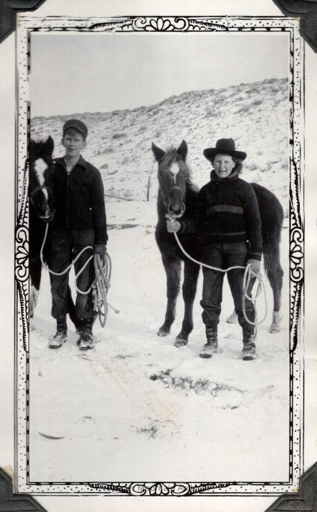 Bryant "Cactus" and Mickey McCleary with horses, circa late 1930s.Photograph Details