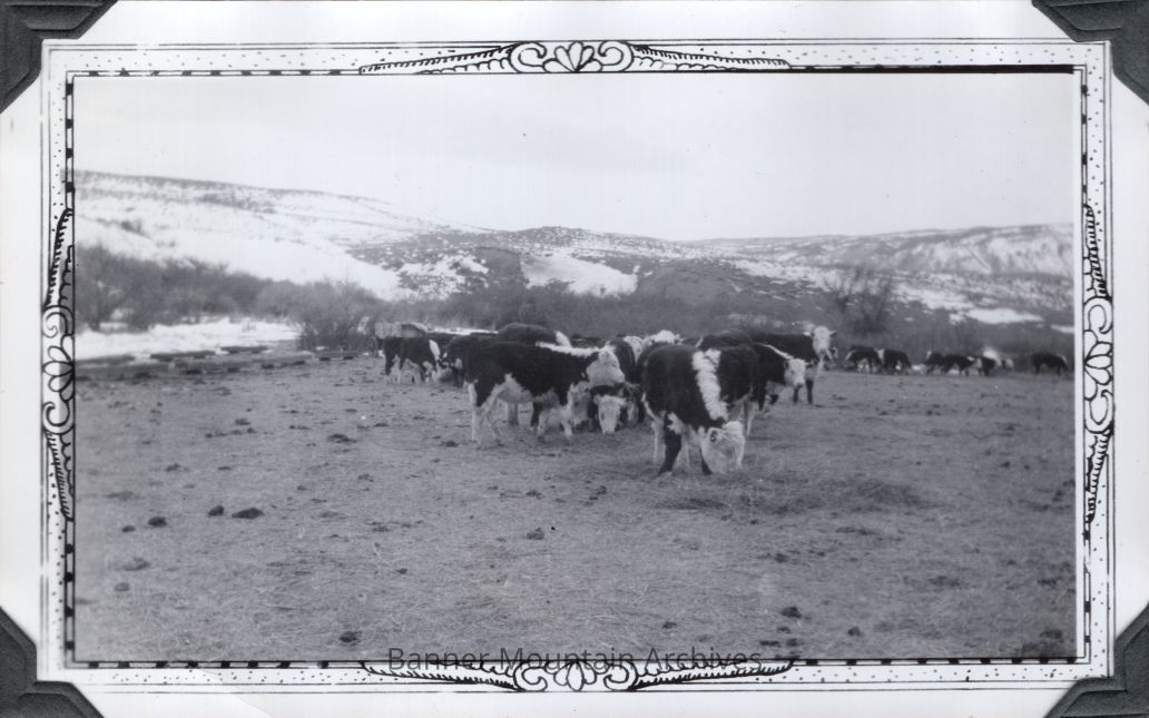 Banner Ranch Hereford cows on the feedline, circa 1930s.