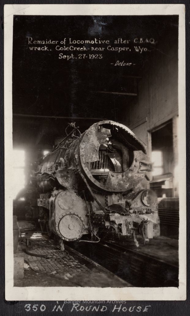 Postcard image of Colorado and Southern steam locomotive #350 in the Casper Roundhouse after being pulled from the streambed of Cole Creek following the Cole Creek Wreck, October 1923.