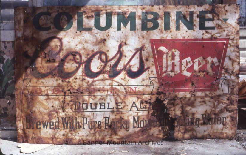 Metal Coors beer sign from the roof of the former story building from the former oil town of Columbine, WY, sign circa 1925, May 1, 1982.Photograph Details