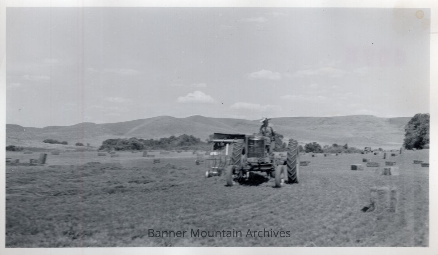 Marion "Mike" McCleary baling hay with the Farmall M, circa 1940s.