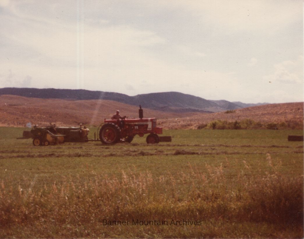 Bryant "Cactus" McCleary baling hay on the Banner Ranch, circa 1980s.