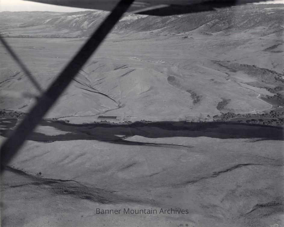 Banner Ranch meadows taken from Bryant "Cactus" McCleary's airplane, lambing shed and weaning corrals visible, circa 1950s.