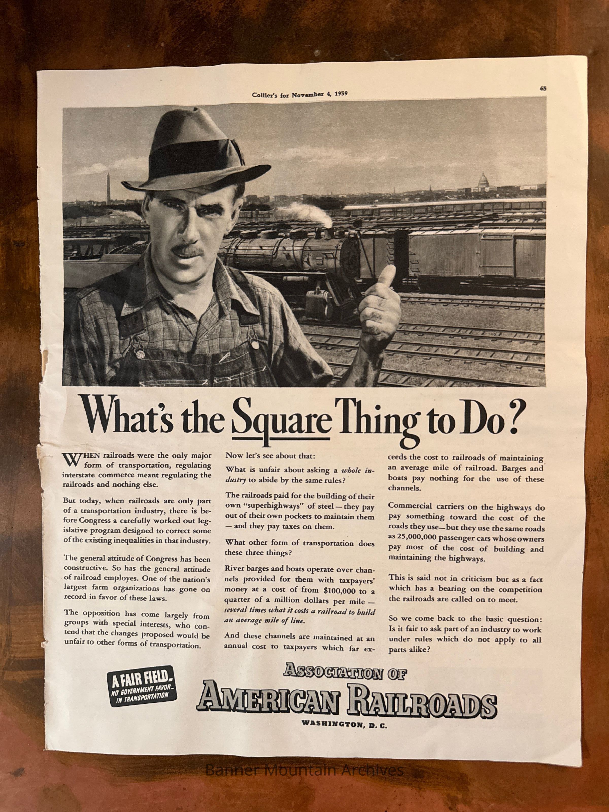 Advertisement from Collier's questioning interstate commerce regulations from the AAR, November 4, 1939.