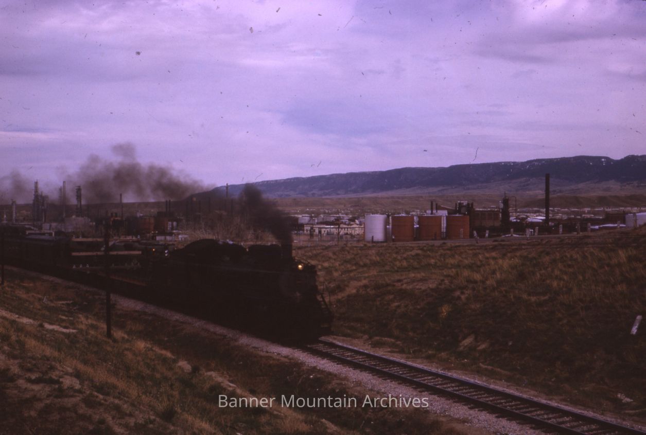 Chicago, Burlington and Quincy Railroad steam locomotive #4960 with two SD9 diesele locomotives and a special passenger train near the overhead bridge west of Casper enroute to Arminto, May 7, 1963.