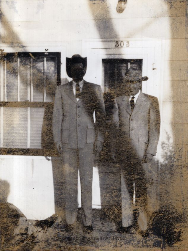 Men in suits outside of a house, possibly Corky Body and Dale Carter, circa 1950s.