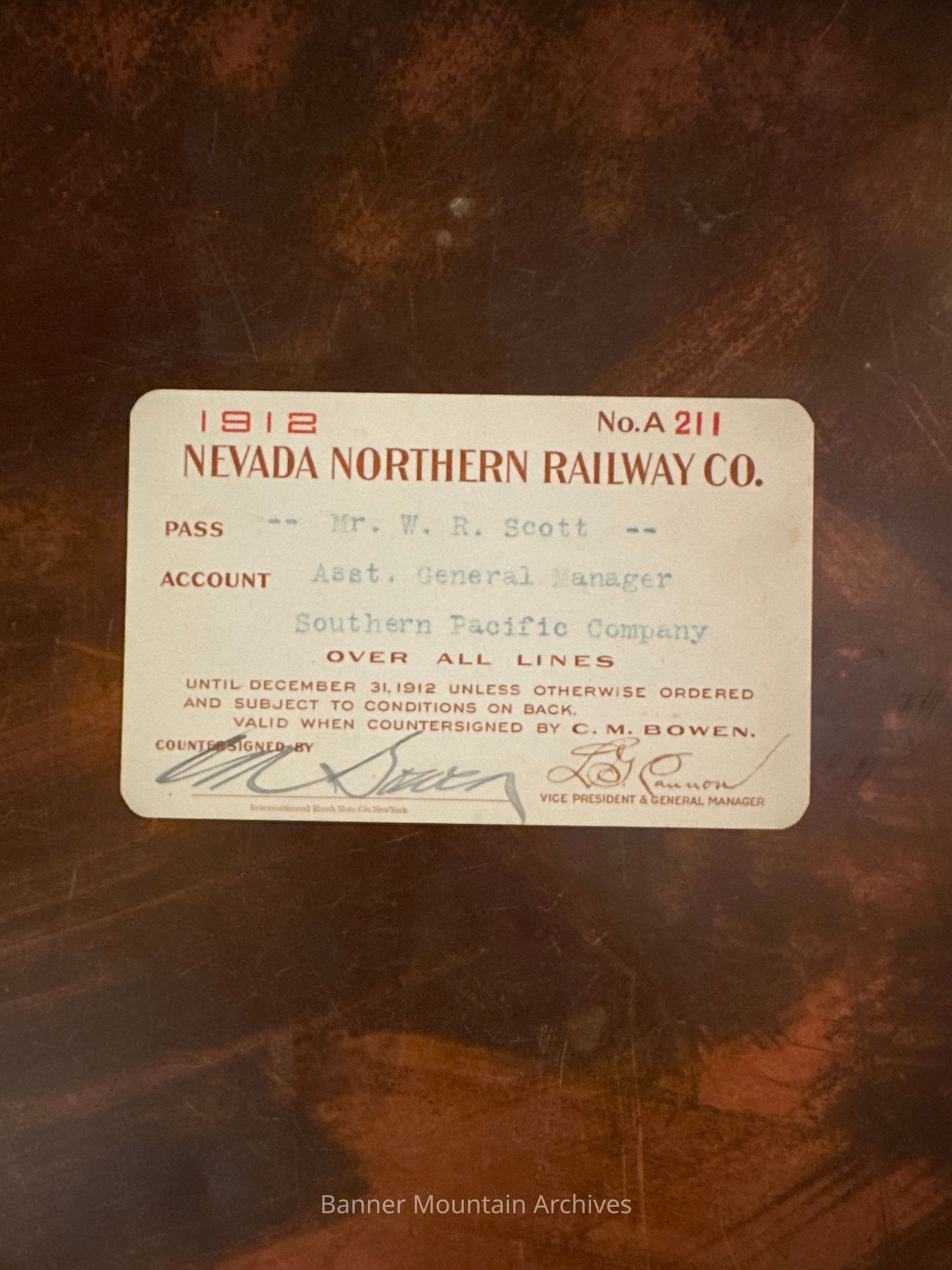 Nevada Northern Railway Pass issued to W.R. Scott, Assistant General Manager for the Southern Pacific Railroad, 1912.